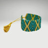 Emerald Horizon – Teal, gold, and turquoise beaded pattern with a golden tassel