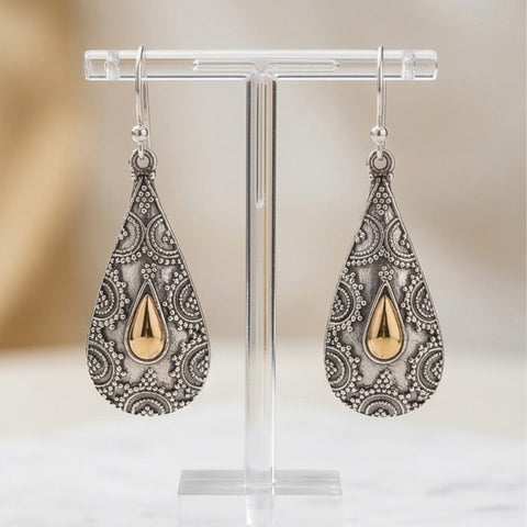 Bali Puri Handcrafted Teardrop Earrings – Sterling Silver & Gold Mixed Metal Dangles